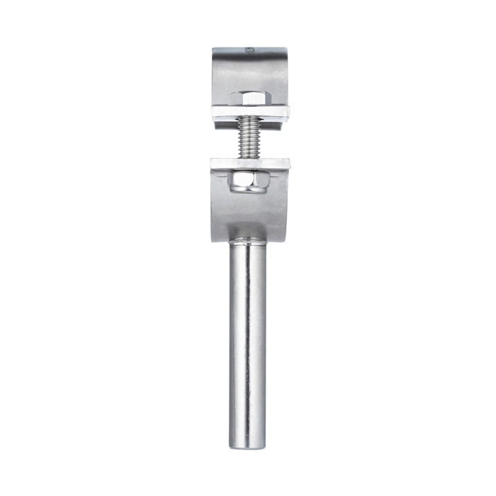 Состоит из двух скоб, одна из которых имеет крепежный стержень, а также двух болтов для фиксации. Изготовлен из нержавеющей стали AISI 304 по стандарту DIN 3567-A. Условный диаметр — DN10 (12-13 мм).
